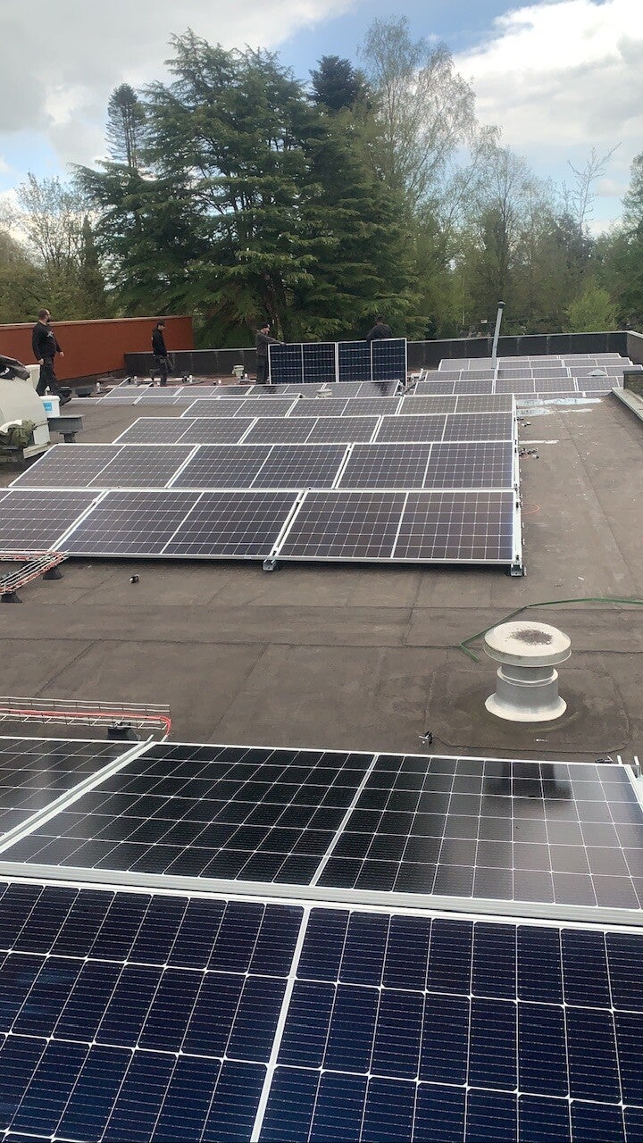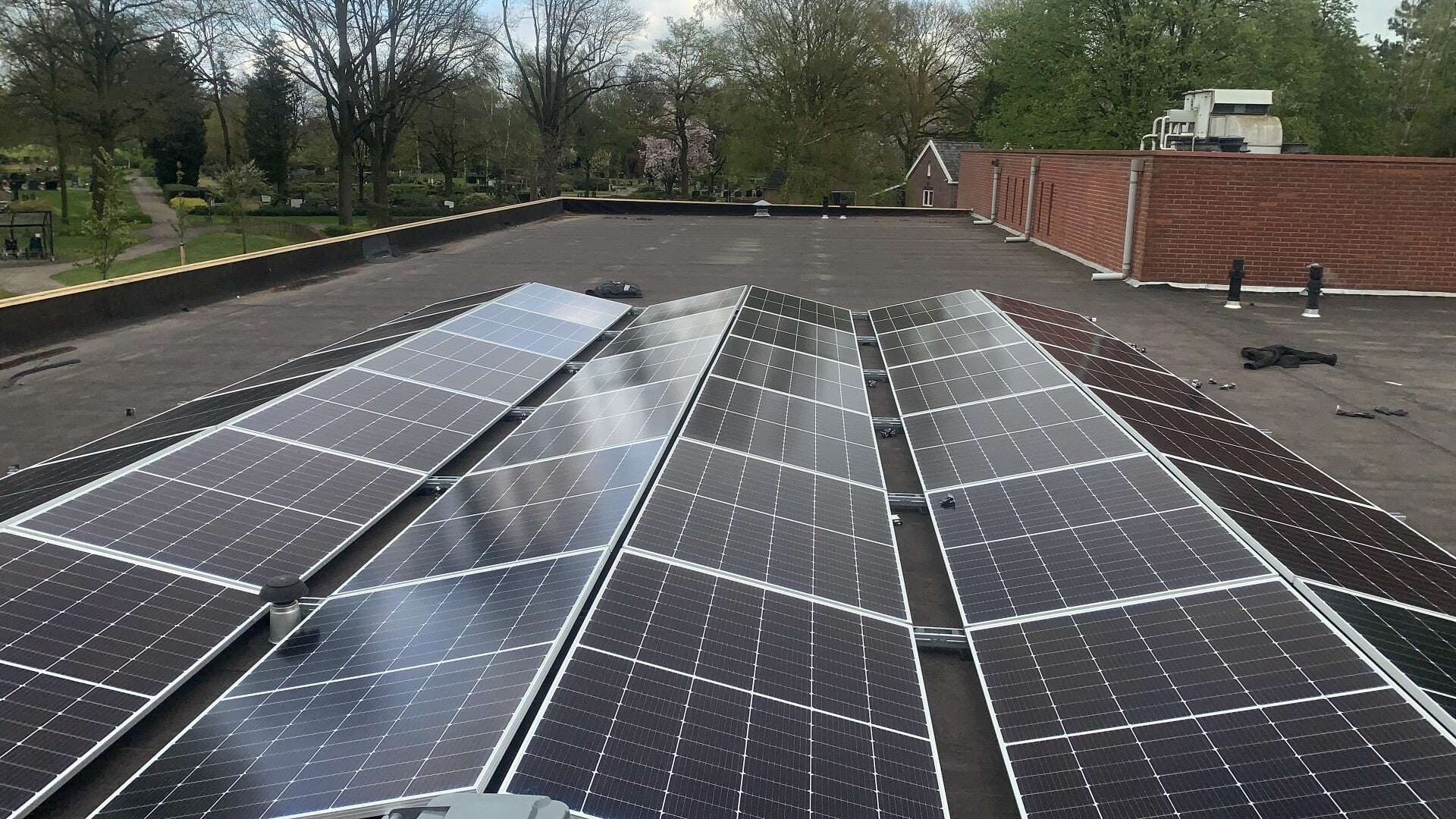 Installatie van 144 zonnepanelen platdak Scope 12 op het crematorium in Aalten.